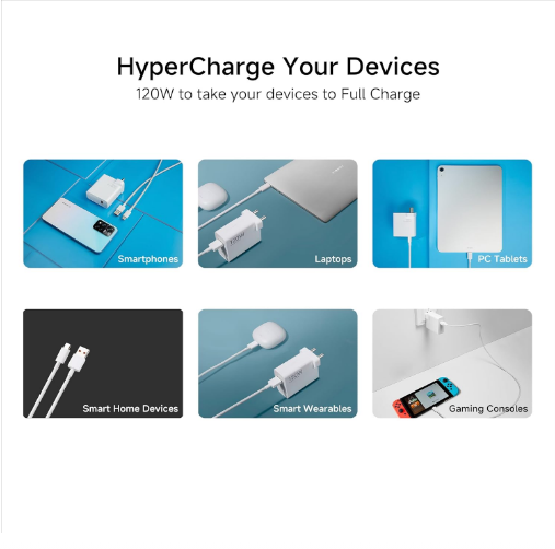 Powerful 120W Output: Rapidly charges your devices with a robust 120W power delivery for both mobile phones and laptops.Includes 6A Hyper Charge Cable: Comes with a high-quality 6A cable for optimal charging speed and efficiency.Universal Compatibility: Works seamlessly with a wide range of Type-C d...