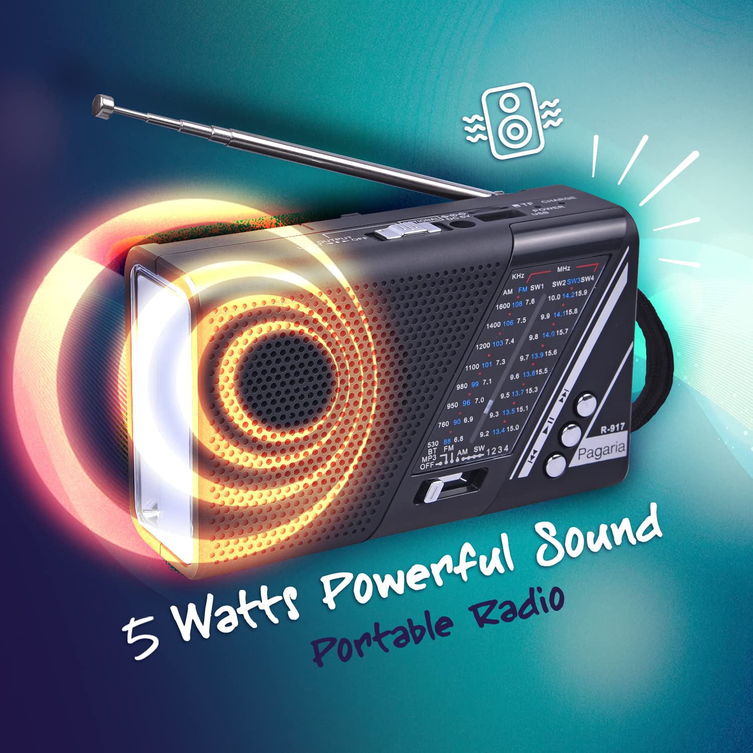 Portable FM/AM/SW Radio with 5 Watts Sound, Bluetooth/USB/TF, Earphone Port & Torch