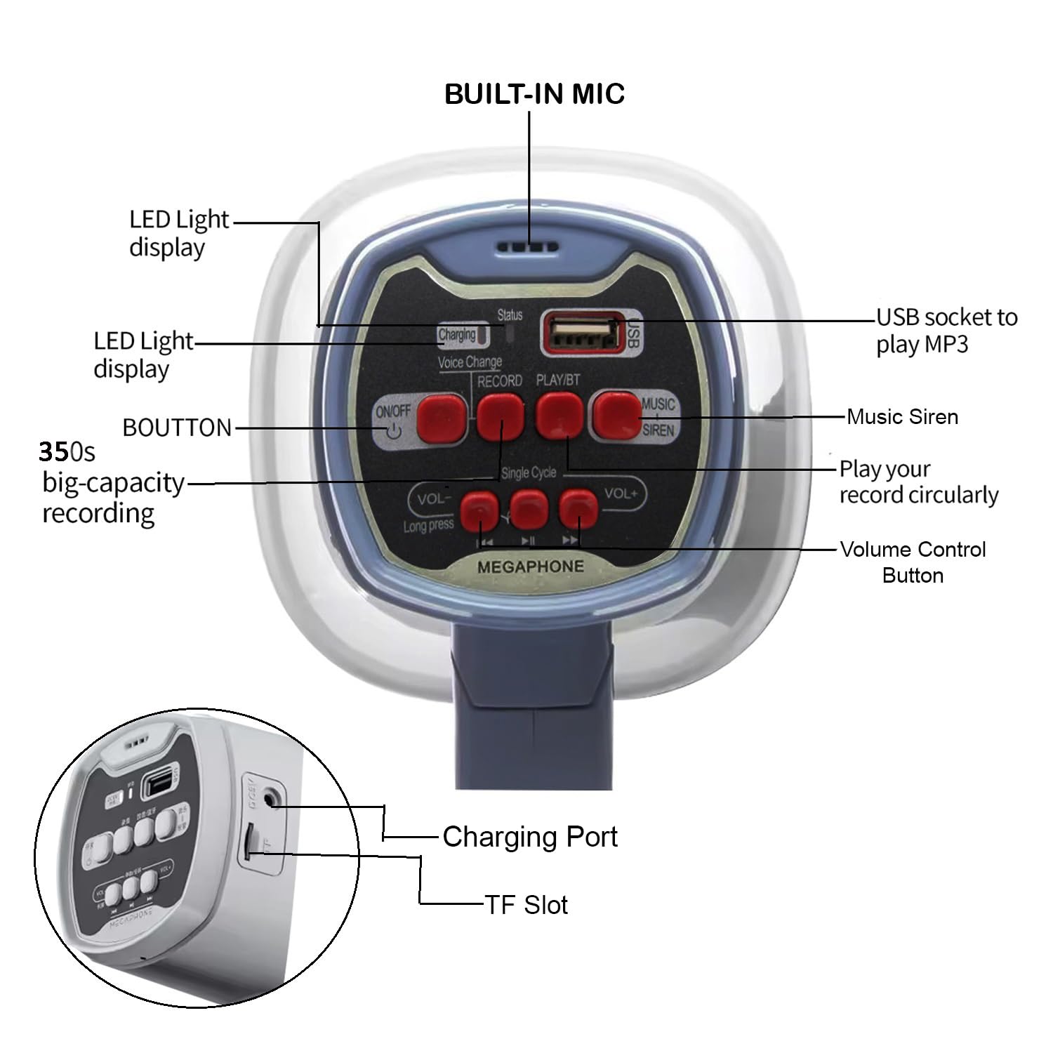 Megaphone Speaker Portable Horn Recorder Player Bluetooth PA System Magic Voice Multiple Sirens Dual Battery