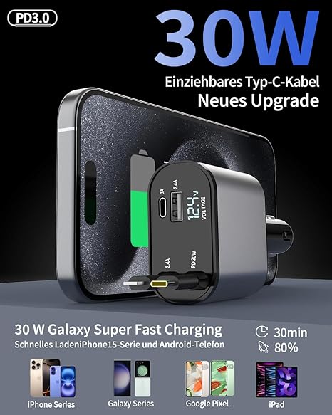 Retractable Car Charger,4 in 1 Dual Port Car Phone Charger,PD Fast Charging Car Charger